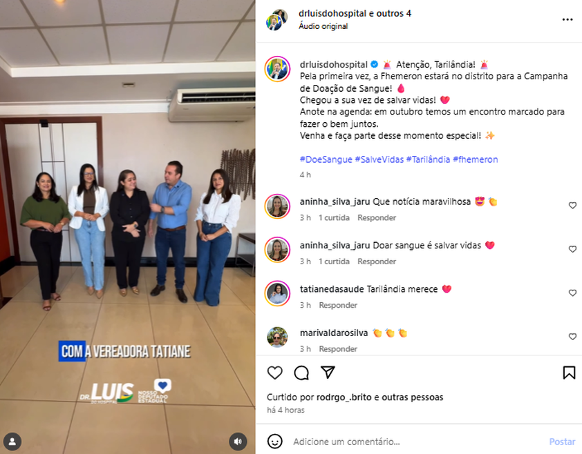 No vídeo de divulgação, o deputado destacou a importância da iniciativa para o distrito e para o município de Jaru. “Atenção, Tarilândia! Temos uma notícia importante para toda a região. Contamos com a participação de vocês nessa campanha inédita de doação de sangue”, afirmou.