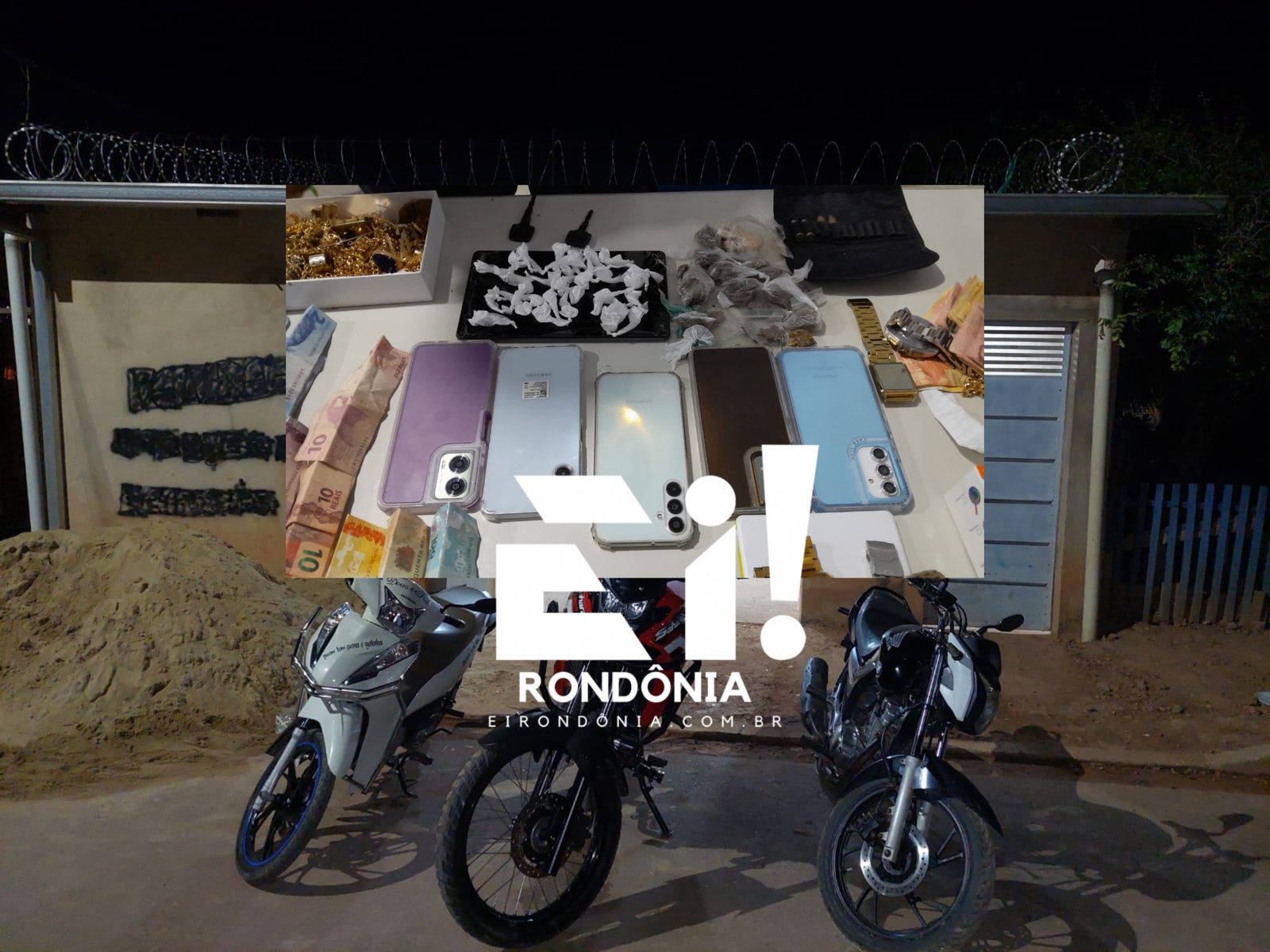 Foram apreendidos 54 invólucros de drogas, munições de calibre .38 e .40, dinheiro em espécie, motocicletas, relógios, celulares e objetos de procedência duvidosa.